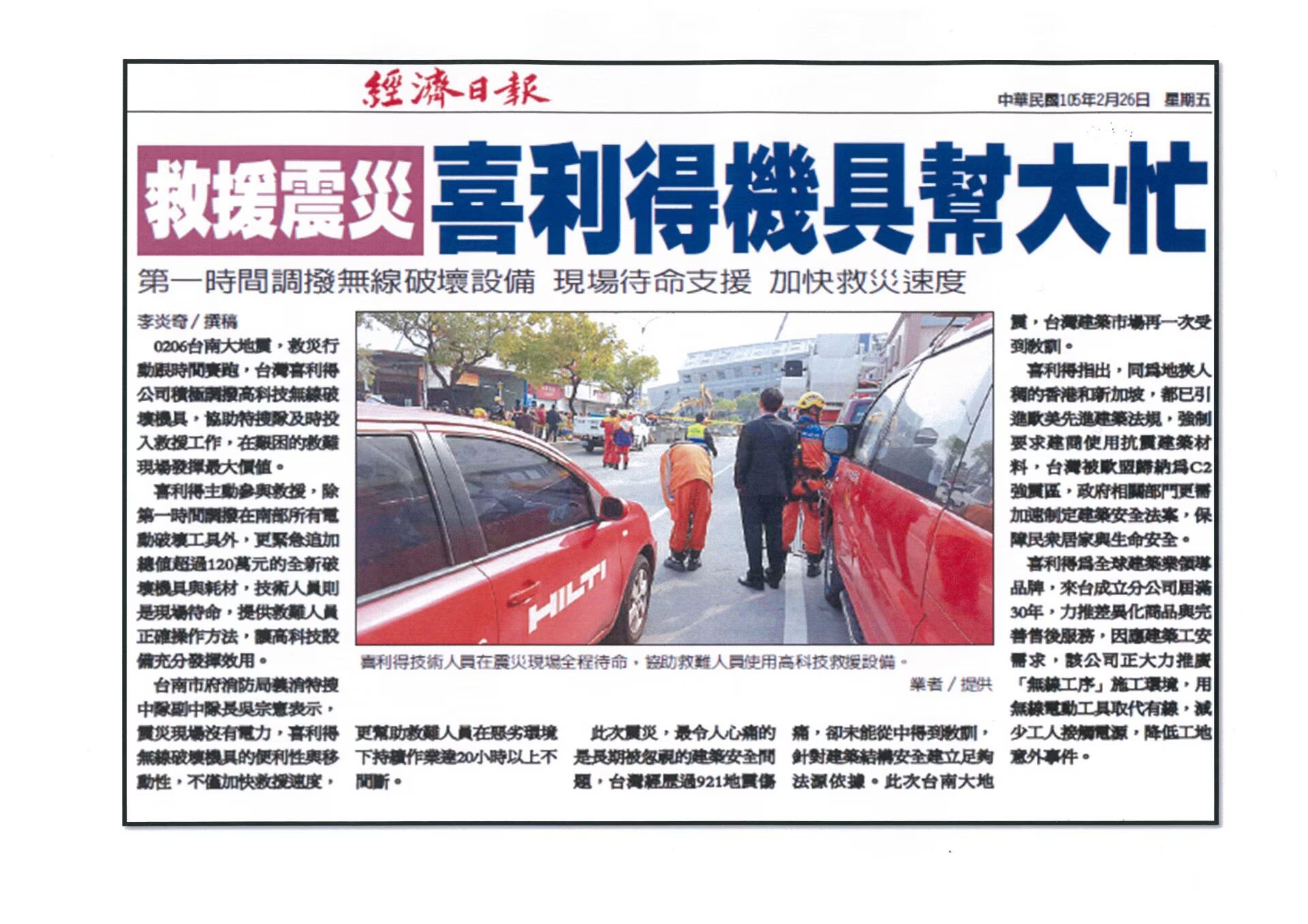 0206台南大地震,救災行動跟時間賽跑,台灣喜利得公司積極調撥高科技無線破壞機具,協助特搜隊及時投入救援工作,在艱困的救難現場發揮最大價值。喜利得主動參與救援,除第一時間調撥在南部所有電動破壞工具外,更緊急追加總值超過120萬元的全新破壞機具與耗材,技術人員則是現場待命,提供救難人員正確操作方法,讓高科技設備充分發揮效用。